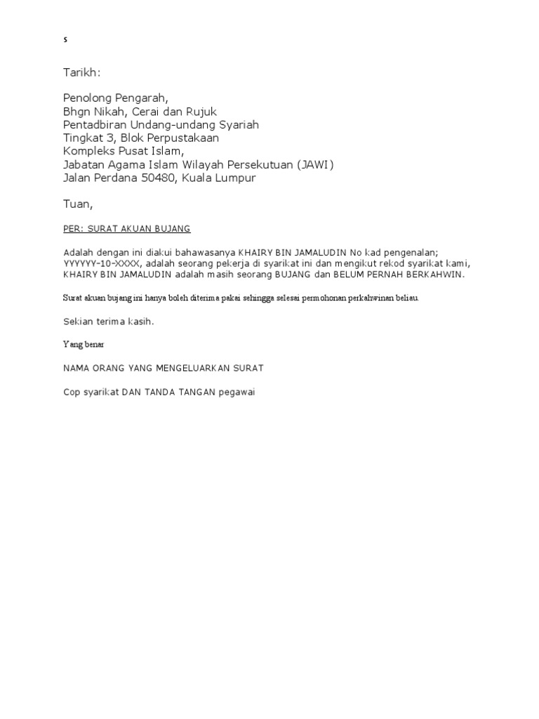 Surat Pengakuan Bujang Untuk Nikah Latest Letter Website